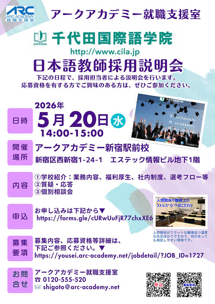 アークアカデミー【日本語教師養成講座部門】【EPA・企業・個人日本語研修部門】で 「総合職・事務局スタッフ」「専任教務」を募集いたします。