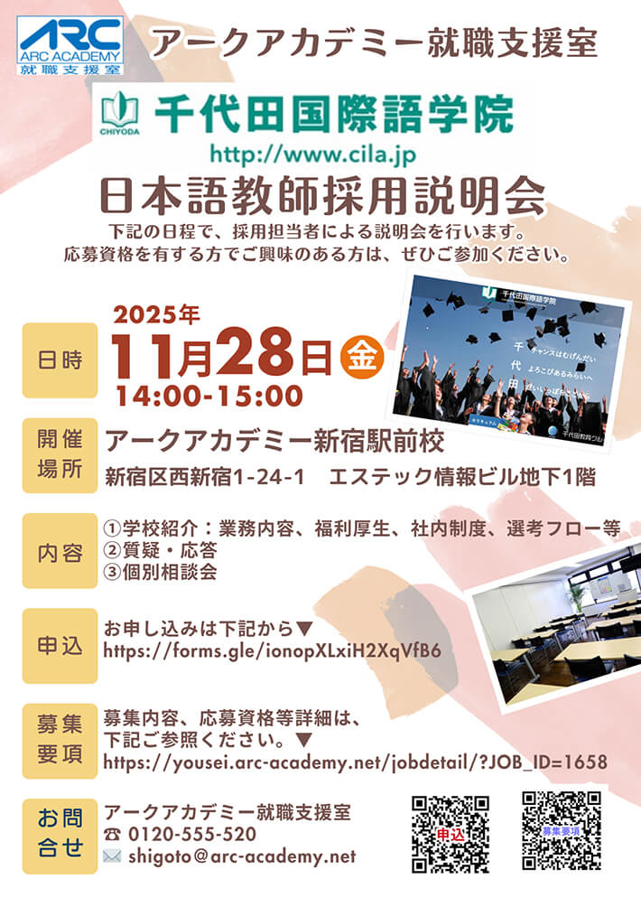 • アークアカデミー就職支援室主催「千代田国際語学院 日本語教師採用説明会」開催(11/28)